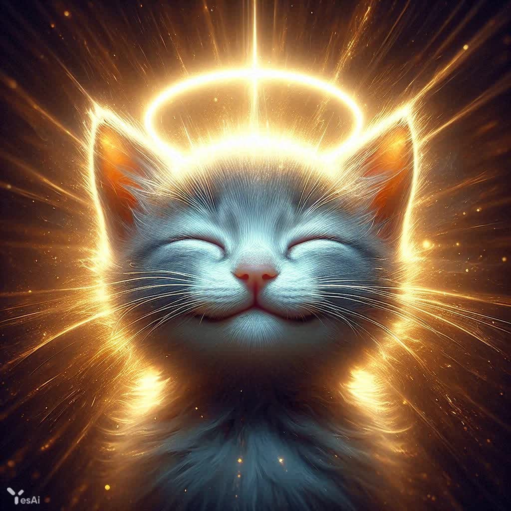 A portrait of a kitten, medium close-up, a sweet face, a pale smile, eyes closed in enjoyment of the moment, above the kitten's head a halo glowing with a bright golden light that illuminates everything around, an amazing luminous effect, a masterpiece of the style of Ciruelo fantasy art, the detail is so high that every hair is visible