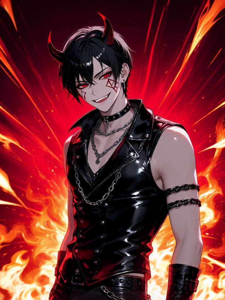 #4 <lora:1914845:1>, anime, illustration, vampire, young man with devilish smile, short black hair and geometric face paint, wearing a black leather vest and chains, BG is crimson with bursts of firelight, intense mood #role_vampire