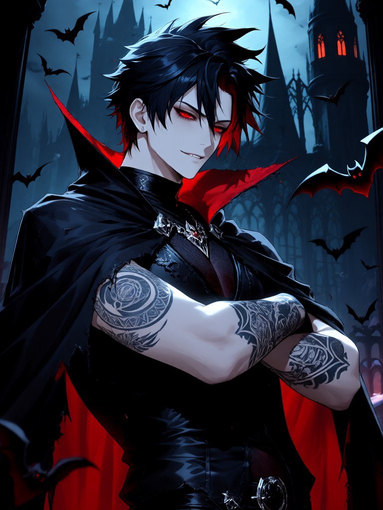 Завораживающая иллюстрация в стиле аниме представляет собой образ молодого вампира с пронзительным взглядом и острыми чертами лица. Его темные волосы собраны в дерзкий стильный ирокез, а на руках заметны замысловатые татуировки, добавляющие образу загадочности и опасности. Вампир облачен в потрепанный черный плащ, подчеркивающий его мрачный характер и принадлежность к миру тьмы. Красные глаза пронзают окружающую темноту, излучая мощную энергию и скрытую угрозу. На заднем плане возвышается величественный готический замок, окутанный тайнами и окруженный стаей летучих мышей, усиливающих атмосферу зловещей торжественности. Вся композиция пронизана напряженной и жуткой атмосферой, передающей сущность вампира – существа, балансирующего на грани света и тьмы, красоты и опасности. Это визуальный рассказ о вечной ночи, скрытых желаниях и неразгаданных тайнах темного мира. Изображение захватывает дух своей детализацией, мастерством исполнения и умением передать эмоциональную глубину персонажа и окружающего его пространства. Вампир предстает перед зрителем не просто как существо из легенд, но и как воплощение внутренней силы, решимости и неизбежной судьбы