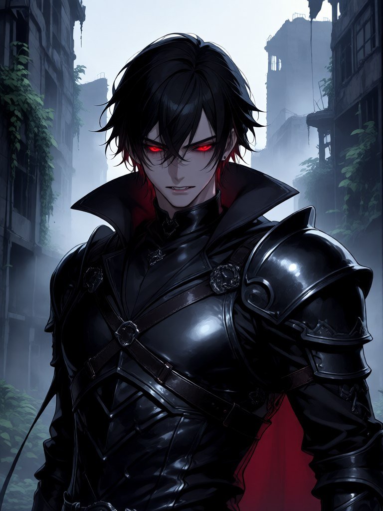#1 <lora:1914845:1>, anime, illustration, vampire, man with black hair and red glowing eyes, wearing dark leather armor, fierce expression, face partially obscured by shadows, standing in a ruined cityscape with overgrown vegetation, the atmosphere dark and brooding, surrounded by hints of mist and fog #role_vampire