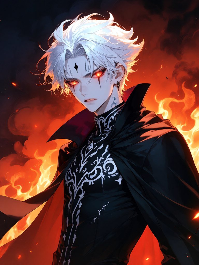 #4 <lora:1914845:1>, anime, illustration, vampire, glowing eyes, young man with white hair styled chaotically, face painted in black and intricate white patterns, intense expression, standing amidst a smoky backdrop with glowing embers, an atmosphere of suspense and intrigue #role_vampire
