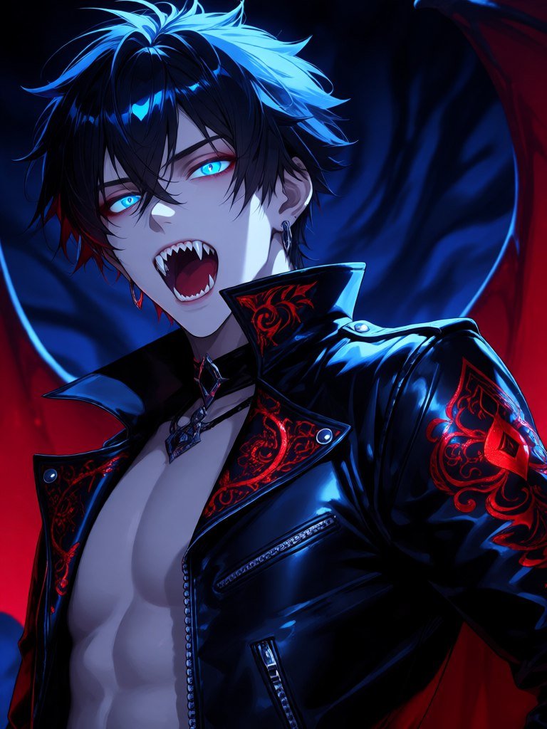 #1 <lora:1914845:1>, anime, illustration, vampire, glowing eyes, young man with spiky hair and piercing blue eyes, wearing a black leather jacket adorned with intricate red designs, mouth open wide revealing sharp fangs, dark ominous backdrop with swirling shadows, intense and dramatic mood #role_vampire