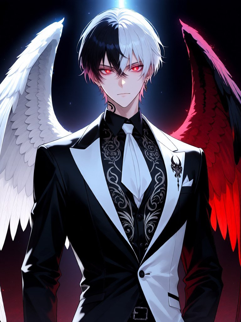 #1. <lora:1914845:1>, anime, illustration, vampire, glowing eyes young man with half angelic white wings and half demonic red wings, serious expression, hair split between dark and light colors, wearing a black and white suit, intricate patterns on his skin, BG is dark with a hint of celestial light and shadow, overall mood mysterious and intense #role_vampire