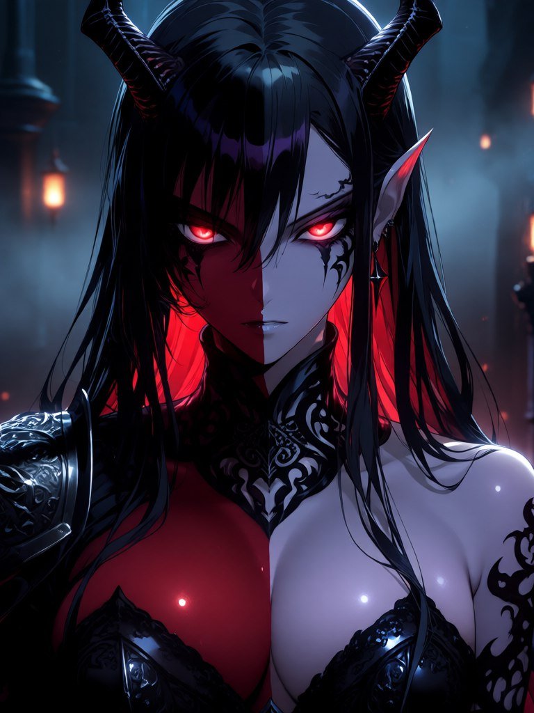 #5. <lora:1914845:1>, anime, illustration, vampire, glowing eyes, a captivating being split between succubus and demon, large glowing crimson eyes, skin painted with intricate black designs, fierce expression with long hair flowing, wearing a mix of dark armor and sultry clothing, spooky misty background with flickering lights, mood is dark and seductive #role_vampire