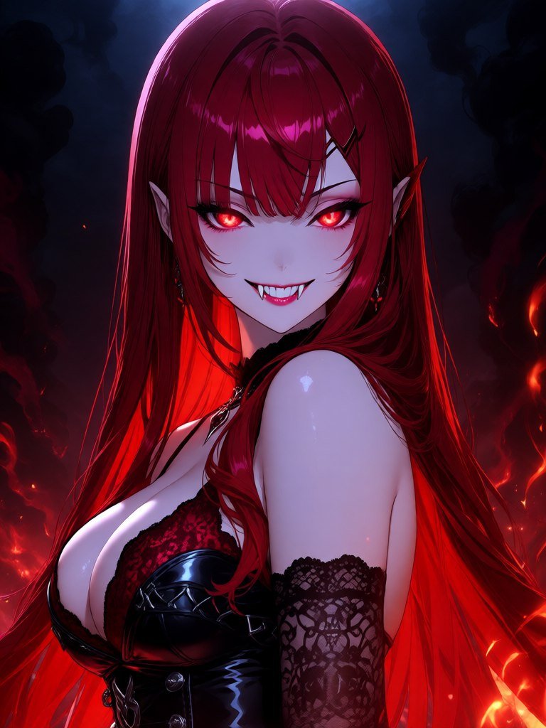 Завораживающая иллюстрация в стиле аниме, изображающая пленительный гибрид вампира и демона-суккуба. В центре внимания – очаровательная героиня с пронзительным взглядом светящихся глаз и манящей улыбкой, демонстрирующей острые клыки. Её соблазнительный наряд, сочетающий в себе элементы кружева и кожи, подчеркивает её загадочную красоту. Длинные, насыщенного бордового цвета волосы ниспадают по плечам, обрамляя лицо с едва заметными светящимися рунами, пронизывающими кожу. Мрачный фон, окутанный намеками на огонь и дым, создает атмосферу зловещей красоты и усиливает ощущение потустороннего очарования. Вся композиция излучает завораживающую ауру тайны и опасности, представляя собой воплощение соблазна и сверхъестественной силы. Этот образ – яркое сочетание невинной графики аниме и готической эстетики вампирской тематики, создавая неповторимый визуальный опыт, который захватывает воображение и погружает зрителя в мир мистики и интриг. Детализация изображения впечатляет богатством оттенков и текстур, от блеска кожи до мерцания рун, что делает его настоящим произведением искусства в цифровом формате