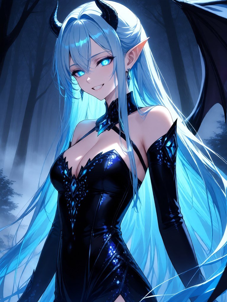 #4. <lora:1914845:1>, anime, illustration, vampire, glowing eyes, elegant demon princess with icy blue hair cascading down, wearing a fitted black outfit with shimmering patterns, piercing blue eyes that seem to glow, posed elegantly with a mysterious smile, misty forest setting in BG, ethereal and beguiling atmosphere #role_vampire