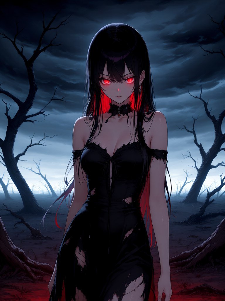 #1. <lora:1914845:1>, anime, illustration, vampire, glowing eyes, young woman with long dark hair, wearing tattered black dress, standing in a barren landscape with twisted trees and shadows, intense gaze with glowing red eyes, dark clouds swirling above, eerie and ominous atmosphere #role_vampire