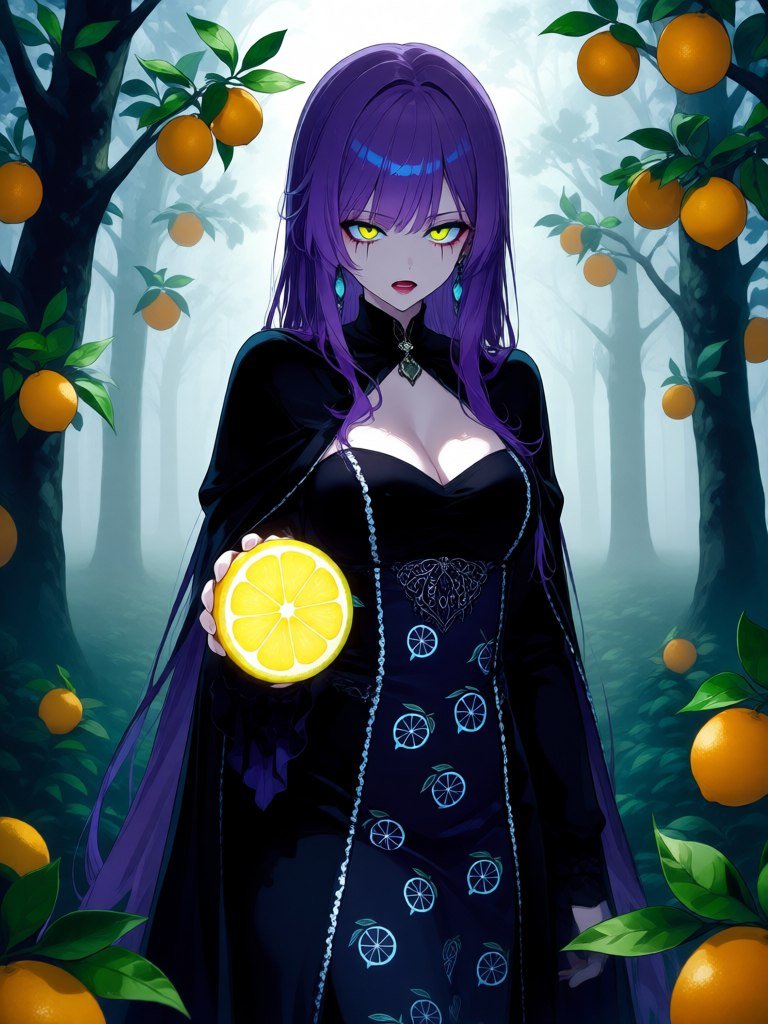 #2. <lora:1914845:1>, anime, illustration, vampire, glowing eyes, witch with vibrant purple hair, wearing a black dress with lemon motifs, standing in a foggy forest filled with citrus trees, holding a glowing lemon in one hand, eyes piercing with an intense gaze, gloomy yet magical ambiance #role_vampire