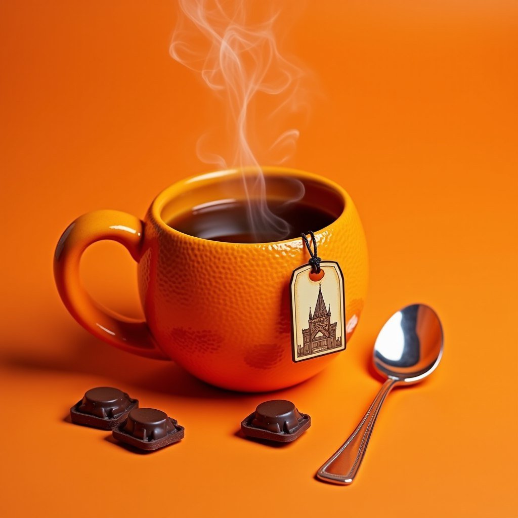 A vivid eye-level shot of a unique orange-shaped mug filled with a steaming dark liquid, from which steam gently rises. The mug has a bright textured orange color that mimics the peel of a real orange and features a handle with a vintage-style tag hanging from it. The tag features a whimsical illustration of a building with a spire. Next to the mug are several pieces of rich dark chocolate, their texture and color contrasting with the smooth, reflective surface of the silver spoon lying nearby. The spoon reflects its surroundings. The entire scene is set against a solid warm orange background, creating a unified color scheme and highlighting ...