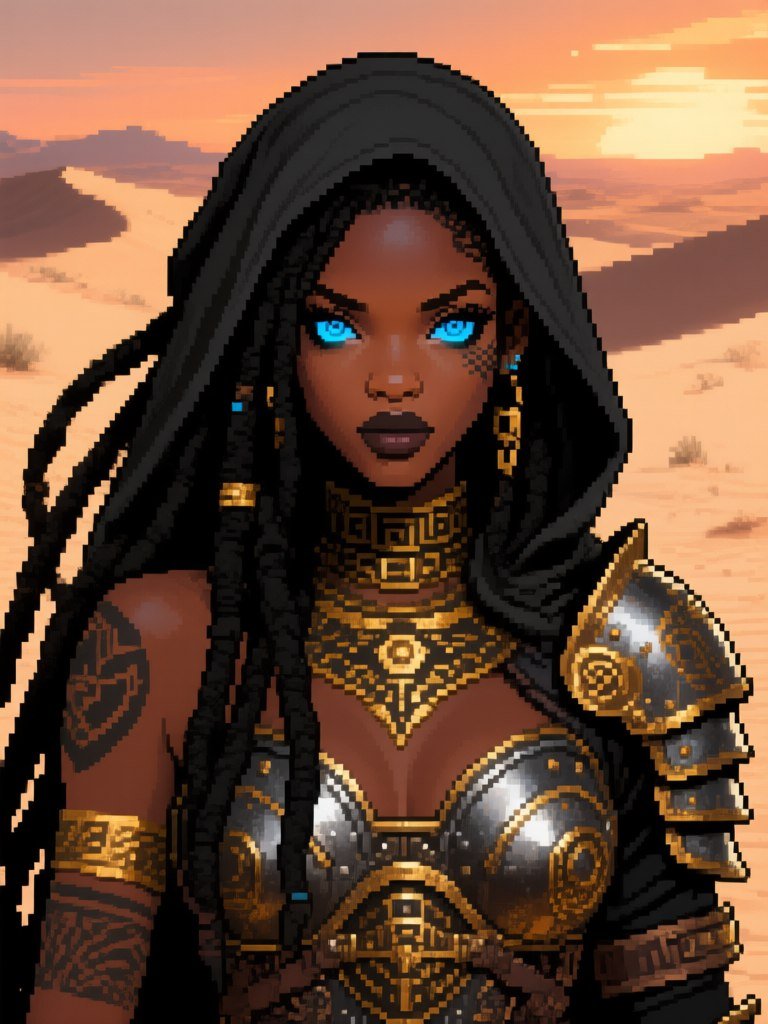 ink drawing, illustration a beautiful black woman with golden tribal tattoos and long dreadlocks, glowing blue eyes without pupils, light brown skin, dressed in ornate metal armor by ray caesar in daz3d pixelated chaos style, shemagh hood covering her face, background is sand dunes at sunset, high contrast photography, symmetrical face in the style of james jean and zendaya, intricate ink illustrations, vray rays, dark fantasy anime, steampunk #role_rune
