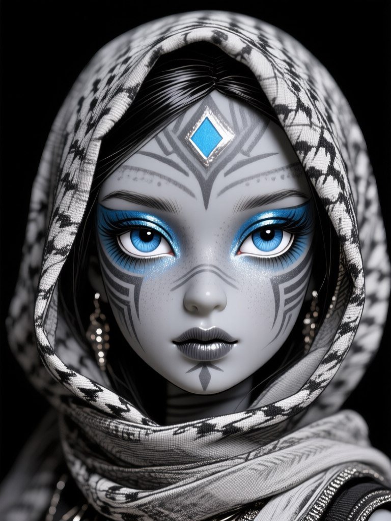 Завораживающий портрет куклы, выполненный в технике черного рисунка. Это невероятно детализированная иллюстрация крупным планом, демонстрирующая сложную конструкцию и поразительную реалистичность. Кукла обладает яркими белыми глазами, бледной серой кожей, украшенной этническими узорами боевой раскраски на лице. Ее взгляд подчеркивают выразительные синие глаза и металлический макияж век, выполненный в стиле гиперреалистичной фотографии, что создает ощущение живого существа. На голове куклы – шемаг, скрывающий большую часть лица, добавляя загадочности и интриги образу. Фон - глубокий черный цвет подчеркивает контраст и акцентирует внимание на деталях самой куклы. Особенно впечатляет проработанная текстура кожи, передающая мельчайшие поры и неровности, создавая иллюзию тактильности. Эффект боке и глубина резкости придают изображению художественную выразительность и фокусируют взгляд зрителя на ключевых элементах портрета, делая его еще более захватывающим и запоминающимся. Это произведение искусства сочетает в себе элементы моды, этники и фантазии, создавая уникальный и неповторимый образ. Взгляд куклы пронзителен и притягивает внимание, оставляя ощущение таинственности и глубокого смысла