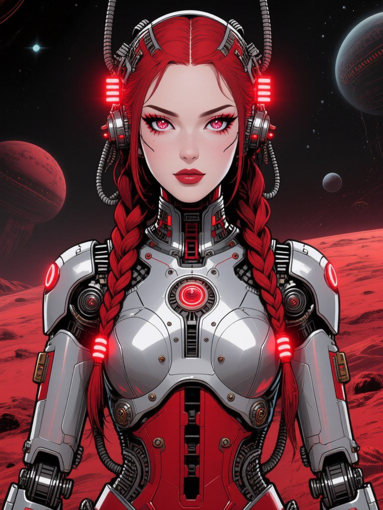 ink drawing, illustration a beautiful female robot portrait in technocore style, red and silver cybernetic makeup, symmetrical face with sparkling eyes looking straight into the camera, tribal braids and red led lights, zbrush steampunk, Catherine Longhurst style character designs, dark fantasy anime, alien planet background #role_rune