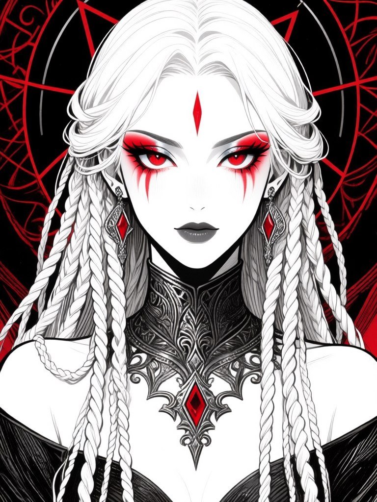 ink drawing, illustration beautiful woman with red and silver eye makeup, symmetrical face with white hair on her shoulders, long dreadlocks, detailed facial features, Emil Melmoth style character designs, dark fantasy anime, intricate ink illustrations. #role_rune