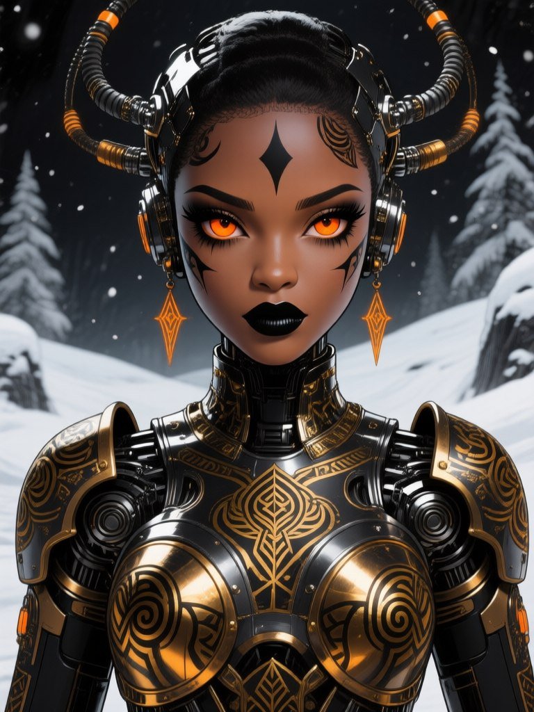 ink drawing, illustration close-up of an elaborate doll with glowing orange eyes and black makeup, cyberpunk android robot in dark fantasy anime style by Ray Caesar inspired by gothic female android dressed in ornate metal armor, daz3d chaos style, Catherine Longhurst style character designs, Swiss graphics, intricate ink illustrations, golden tribal tattoos, symmetrical face and makeup in the style of James Jean and Zendaya, vray rays, chiaroscuro style, dark and amber colors, snowy landscapes, adding depth and texture to the scene. #role_rune
