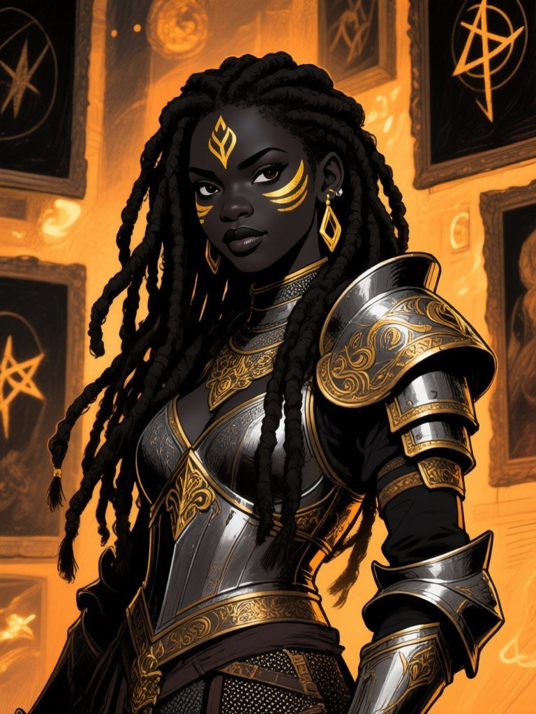 #2. ink drawing, illustration of a black woman with long dreadlocks and golden facial markings, her expression serious yet playful, dressed in ornate armor, set against a backdrop of dark paintings filled with amber light #role_rune
