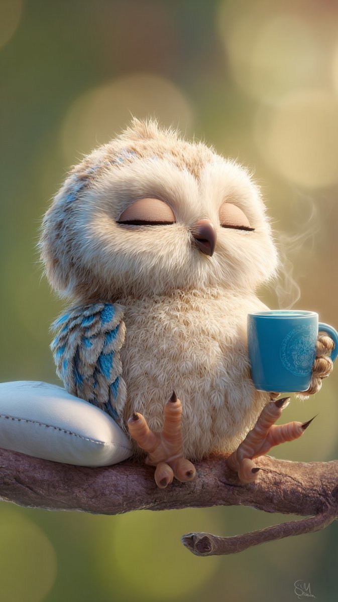 A cute, fluffy baby owl with one eye closed, holding a blue coffee mug in one hand and a charming white pillow in the other, sitting on a branch in the morning sun, in a Pixar-style, super-detailed, high-resolution, colorful, soft lighting, and bokeh effect. The scene is filled with a smile, a relaxing, peaceful mood, soothing colors, and a green background, in an anime chibi style. --ar 9:16