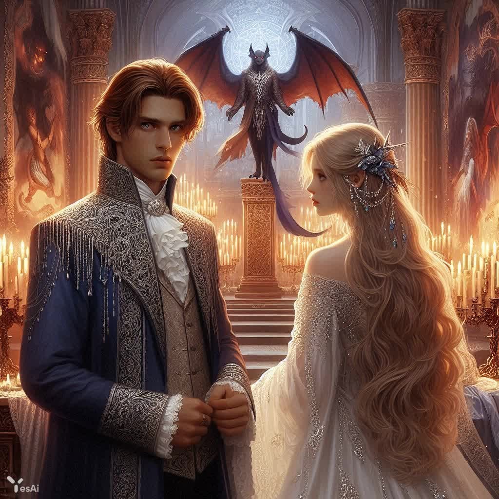 В центре внимания – напряженное противостояние двух могущественных фигур на фоне древнего храма. Властный лорд с каштановыми волосами, облаченный в богато вышитую серебром робу, пристально смотрит на свою необычную супругу. Ее длинные светлые волосы аккуратно собраны заколкой, а вместо привычных крыльев – кожистые перепончатые, напоминающие крылья летучей мыши. Она одета в платье, украшенное жемчугом, и ее взгляд так же устремлен на зрителя, словно она пытается разгадать его намерения. Атмосфера вокруг пронизана мистикой и древней силой. Полумрак храма освещают мерцающие огоньки множества свечей, а стены украшены таинственными рунами. В воздухе витает терпкий аромат благовоний, усиливающий ощущение погружения в нечто потустороннее. Картина выполнена в стиле гиперреализма, что позволяет детально рассмотреть каждую черту лиц персонажей, текстуру тканей и игру света и тени. Отношения между ними сложны и полны скрытых смыслов. В их взглядах читается смесь власти, подчинения, любопытства и, возможно, даже страха. Что привело этих двоих к алтарю? Какая судьба ждет их впереди? Эта сцена заставляет задуматься о природе любви, долга и силы, а также о тайнах, скрытых в глубинах древних храмов и могущественных родов. Художник мастерски передал напряженность момента, создавая ощущение предвкушения чего-то важного и неизбежного. Это не просто изображение, это окно в мир магии и интриг, где каждый взгляд имеет значение, а каждая деталь рассказывает свою историю