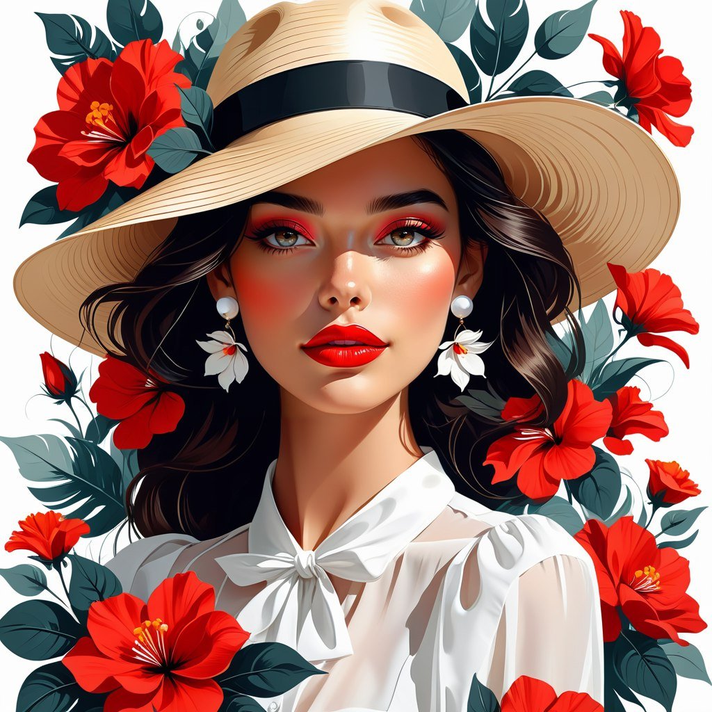 девушка в широкополой шляпе с крупными цветами. Белая рубашка, убранные волосы с несколькими небрежно выбивающимися прядями. Серьги в тон цветам, акцентные алые губы. Четкие векторные контуры, графичный стиль, яркая цветовая палитра. Романтичный и элегантный образ, минималистичная композиция, равномерная заливка. Детализация текстуры шляпы и цветов, выразительные линии. Иллюстрация для дизайна, блогов или полиграфии. Фон прозрачный или нейтральный