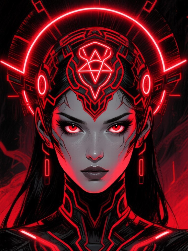#5. ink drawing, illustration, glowing neon eyes, close-up portrait of a woman with futuristic appearance, face covered in intricate red and black designs, large headpiece creating a powerful effect, background dark and mysterious, capturing an intense expression #role_rune