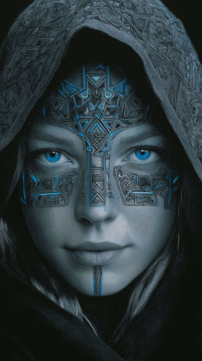 #4. ink drawing, illustration, piercing eyes, close-up portrait of woman in hooded cloak of dark fabric, blue eyes, face painted with geometric shapes and glowing lines, intricate designs across her cloak, serious expression, the overall mood dark and mysterious #role_rune
