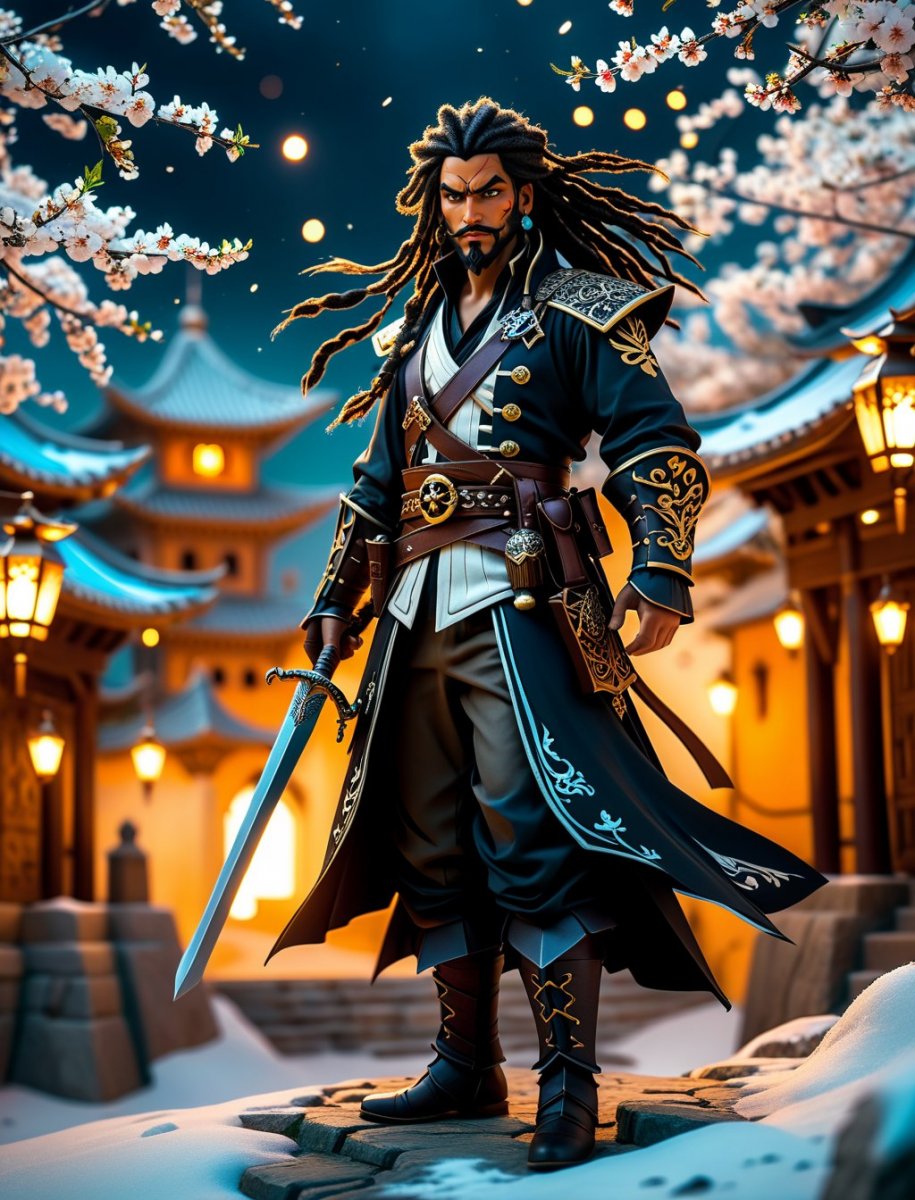 Papercraft, Fireworks, Diamond, Portal, Snow cover, Pirate, Swirl patterns, Cherry blossoms, Filigree, Gothic, Stars, Persian, Shine, Shadows, Hill, Emperor, The citadel, Dynamic posture, He holds a sword in his teeth, Shield, Dreadlocks, a black patch on his right eye, warm tones