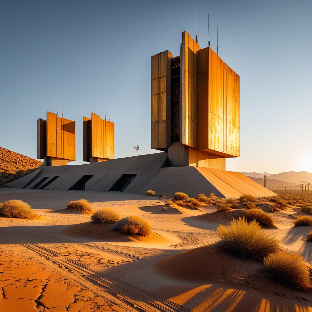 Монументальный бетон в пустыне Намибии: мрачная станция связи у Виндхука - Картинка, сгенерированная нейросетью Stable Diffusion