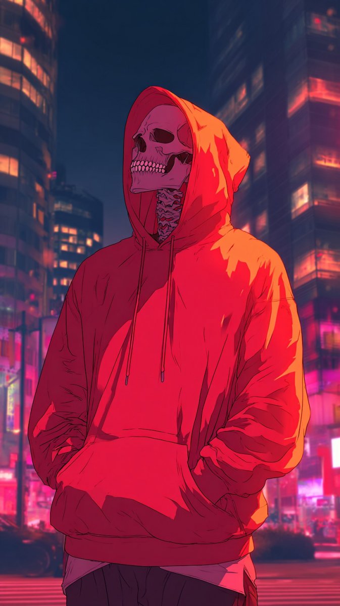 В этом жутком и загадочном снимке запечатлен силуэт человека в красном худи. На темной ткани куртки выделяется зловещий рисунок с черепом, чьи острые зубы словно предвещают опасность. Ночное время действия разворачивается на оживленной городской улице, где неоновые огни создают призрачный свет, окутывая все вокруг густым туманом. Атмосфера пропитана зловещей тайной и ощущением тревоги, а фон представляет собой ночной городской пейзаж, освещенный дождем. Кажется, будто персонаж – мрачный страж этого бетонного лабиринта, воплощение силы и возмездия в сумеречном городе. Он стоит неподвижно, словно ожидая наступления темноты, готовый обрушить свой гнев на тех, кто осмелится нарушить его правила. Этот образ – квинтэссенция мрачной эстетики, сочетающая в себе элементы городской антиутопии и сверхъестественного ужаса. Изображение передает чувство одиночества, опасности и неизбежности, заставляя зрителя задуматься о природе справедливости и последствиях нарушения закона. Каждый элемент композиции работает на создание напряженной атмосферы, погружая в мир ночных кошмаров и скрытых угроз