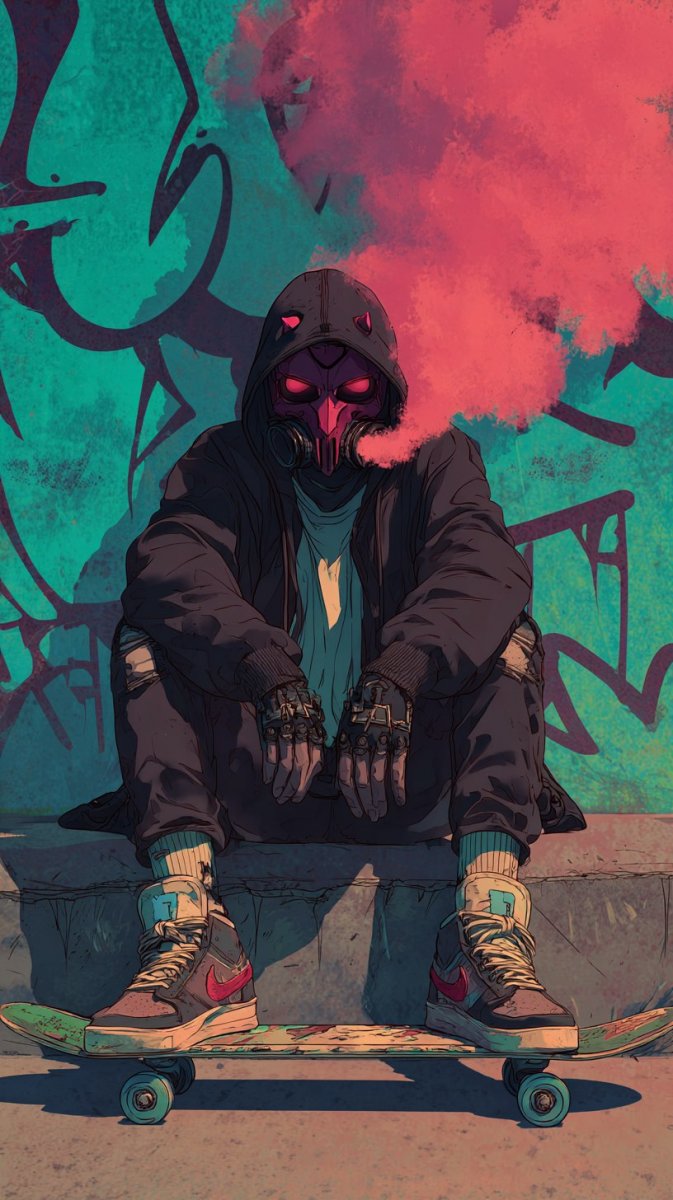 Захватывающее изображение персонажа из вселенной Mortal Kombat X, воплощающего собой энергию и динамику современной уличной культуры. На фоне заброшенного переулка, увешанного яркими граффити, молодой человек ловко катается на скейтборде, демонстрируя мастерство и уверенность в каждом движении. Его силуэт выделяется благодаря черному худи, а загадочность образа подчеркивает маска демона, скрывающая часть лица. Вокруг него клубится густой дым насыщенных красного и синего цветов, создавая атмосферу таинственности и предчувствия надвигающейся опасности. Темный футуристический фон усиливает ощущение напряжения и драматизма происходящего, погружая зрителя в мир жестоких сражений и непредсказуемых поворотов. Картина пронизана мощной энергией действия, передающей интенсивность и адреналин культовых поединков Mortal Kombat X, а также отражающую бунтарский дух уличных скейтеров. Это визуальное воплощение силы, решительности и готовности к борьбе в мире, где каждый день – это вызов. Изображение прекрасно передает суть персонажа, сочетая элементы видеоигры с эстетикой современной городской культуры, создавая уникальный и запоминающийся образ