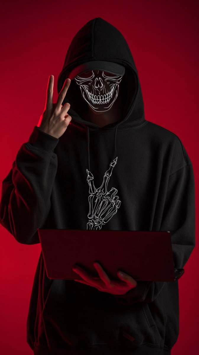 Мрачный киберпанк-портрет, где фигурирует загадочная личность в черном худи с черепом. Выражение лица – смесь угрозы и неожиданного примирения, подчеркнутая острыми зубами и когтями. В одной руке персонаж держит поднятую ладонь, словно предлагая мирный жест, что создает интригующий контраст с его хищной внешностью. На фоне – хаотично разбросанные предметы на столе перед открытым ноутбуком, намекающие на напряженную работу или недавнюю конфронтацию. Красные огни акцентируют атмосферу опасности и напряжения, а драматическое освещение подчеркивает глубину и детализацию изображения. Стиль фотографии выполнен в духе киберпанка, с его характерной эстетикой неоновых цветов, высоких технологий и мрачного будущего. Вся композиция пропитана ощущением скрытой силы и готовности к действию, оставляя зрителя в состоянии ожидания дальнейших событий. Изображение словно запечатлело момент между угрозой и перемирием, погружая в мир сложных моральных дилемм и технологического прогресса. Персонаж излучает ауру загадочности и опасности, представляя собой воплощение антигероя в мире высоких технологий и темных тайн. Он словно предвестник перемен, готовый к выполнению своей миссии в этом мрачном киберпанковом будущем