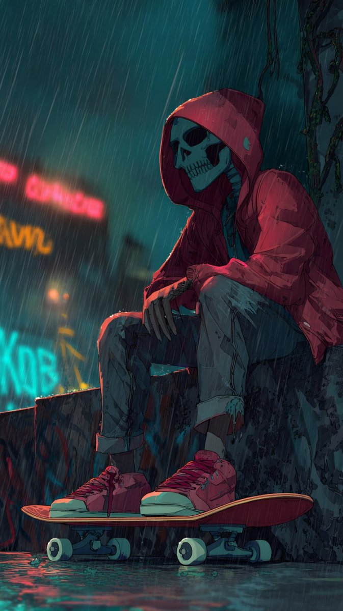 Мрачный городской пейзаж оживает в этом захватывающем изображении. Скейтбордист, окутанный тайной и опасностью, скользит по темному переулку, украшенному яркими граффити. Его фигура скрыта под алым капюшоном с жутковатым дизайном черепа и острыми зубами, добавляя образу загадочности и угрозы. Размытый фон указывает на дождливый день, когда капли дождя падают на землю, создавая атмосферу меланхолии и неопределенности. Неоновые огни пронзают темноту, подсвечивая сцену призрачным светом и усиливая ощущение тревоги. Атмосфера пропитана жутким настроением, а городской ночной пейзаж служит зловещим фоном для этого динамичного момента. Кажется, что персонаж движется сквозь время и пространство, оставаясь неуловимым и загадочным. Изображение захватывает дух своей мрачностью и динамикой, предлагая зрителям заглянуть в мир скрытых опасностей и ночных приключений. Этот кадр – свидетельство смелости и дерзости, воплощенных в образе скейтбордиста, который бросает вызов окружающему миру. Дождь добавляет драматизма, а граффити на стенах переулка придают изображению глубину и смысл, отражая бунтарский дух городской культуры. Это не просто фотография – это история, рассказанная через движение, свет и тень