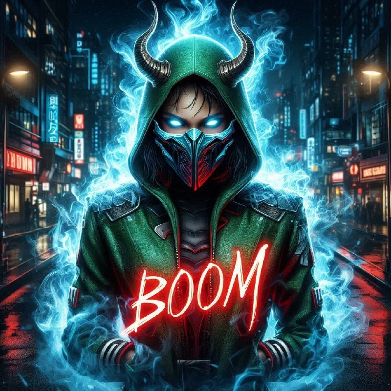 digital illustration of character from video game mortal kombat x, person wearing green hoodie, demon mask with two horns, covered in blue smoke, standing on city street at night, word "boom" in red neon letters, eerie and mysterious mood, BG is futuristic cityscape #role_punisher