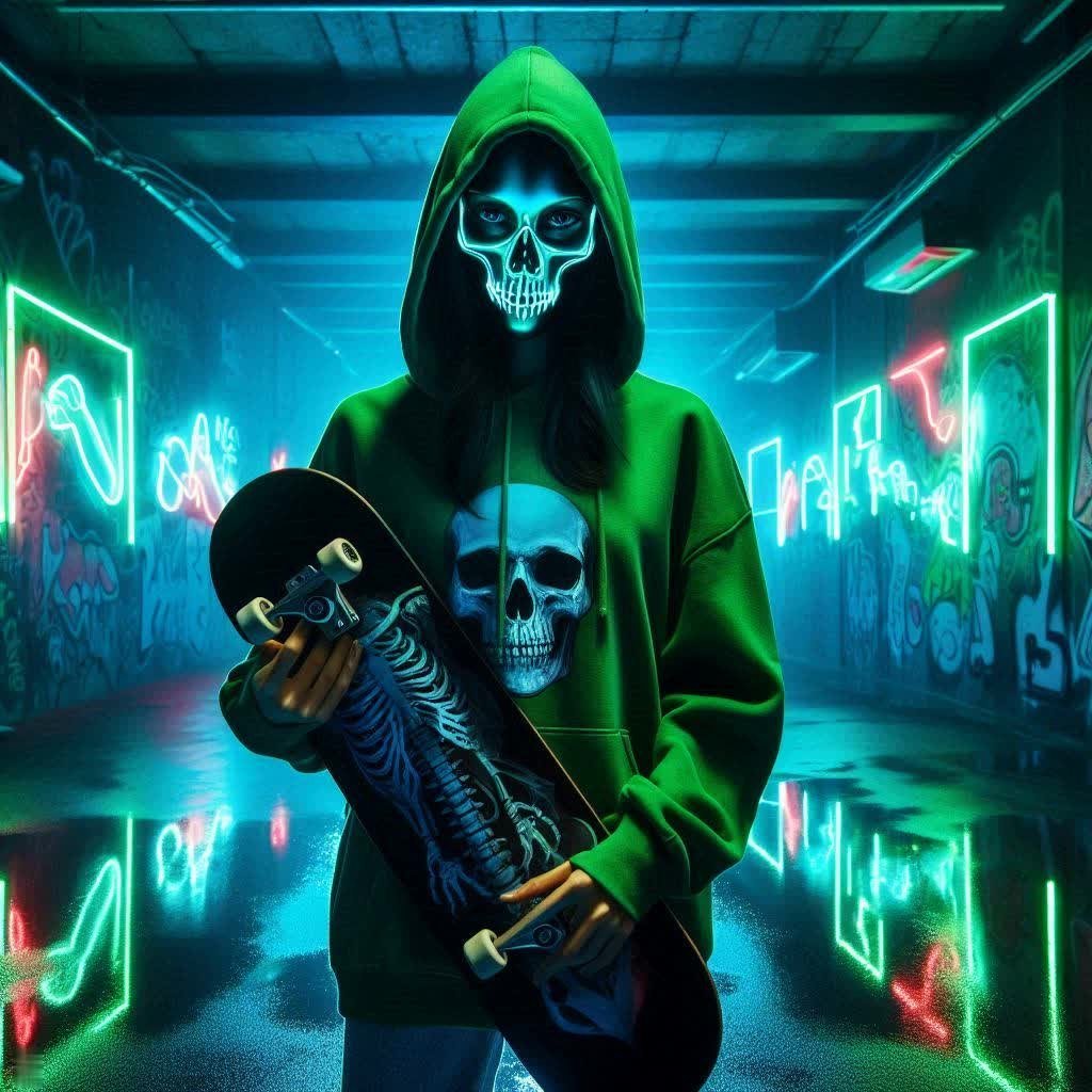 В полумраке неонового города запечатлён загадочный персонаж в зелёном худи и маске с рисунком черепа. В руке – скейтборд, а вокруг – буйство ярких граффити, отражающихся на мокром асфальте. Драматичное освещение создает жутковатую атмосферу тайны и неопределённости, намекая на биомиметические элементы в образе и вызывая размышления об этических аспектах подобной трансформации. Картина пронизана духом мрачного героизма и опасного приключения, словно предвещая роль безжалостного мстителя. Неоновые блики играют на поверхности, подчеркивая контраст между реальностью и вымышленным миром. Композиция захватывает динамикой и погружает зрителя в атмосферу киберпанка с элементами научной фантастики. Атмосфера пропитана ощущением скрытой угрозы и неизбежности, где каждый неоновый отблеск может быть последним предупреждением. Образ сочетает в себе уличную культуру скейтбординга и футуристический дизайн, создавая уникальный визуальный язык. Это не просто портрет – это история, рассказанная с помощью света, тени и символов, вызывающая вопросы о границах человеческого и искусственного, морали и справедливости в мире высоких технологий. Впечатление усиливается благодаря мастерской работе со светом, который подчеркивает детали маски и создает ощущение глубины пространства, уводя взгляд в бесконечный лабиринт неоновых улиц. Этот образ – воплощение современной городской мифологии, где прошлое переплетается с будущим, а герой вынужден бороться за выживание в мире, полном опасностей и тайн