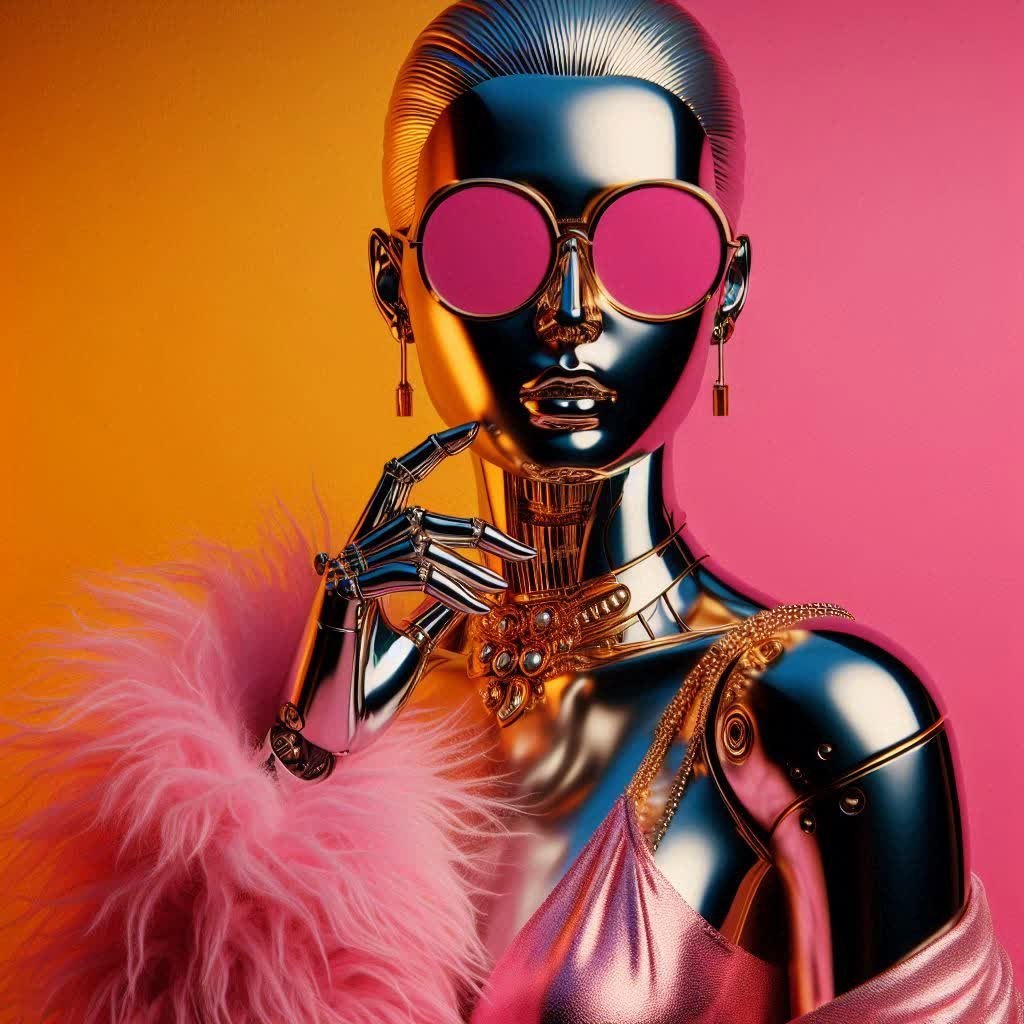 Восхитительный образ футуристической дивы: хромированный робот в пышном розовом платье, сияющем золотыми акцентами и стильными солнцезащитными очками. Уверенная поза на фоне яркого контрастного фона переносит нас в эпоху ретрофутуризма, вдохновленного эстетикой Хадзимэ Сораямы. Каждая деталь проработана с невероятной точностью, а высокое разрешение и ультрареалистичность создают ощущение полного погружения в этот сюрреалистичный мир моды. Яркие неоновые цвета восьмидесятых придают изображению неповторимую атмосферу мечтательности и глянцевого шика. Это не просто портрет – это визуальная ода современной моде, смело сочетающая механику и элегантность, холодный металл и пушистую текстуру. Изображение излучает уверенность, силу и красоту в неожиданном, но невероятно привлекательном исполнении. Воплощение мечты о будущем, где технологии и стиль сливаются воедино, создавая поистине незабываемый образ. Роботизированная элегантность в розовом облаке футуристической эстетики – это визуальный шедевр, достойный внимания ценителей современного искусства и моды. Кажется, будто она сошла с обложки глянцевого журнала далекого будущего, где роботы правят миром стиля