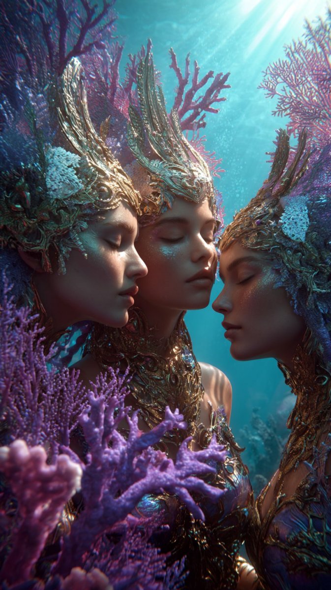 Sea sirens, graceful figures with shimmering scales, flowing seaweed hair, coral crowns, turquoise and purple hues blending seamlessly, fantasy art, surrealism, Alphonse Mucha, Art Nouveau style, detailed facial features, iridescent skin texture, underwater kingdom backdrop, bioluminescent flora, soft volumetric lighting, golden hour sunlight filtering through the water surface, 8k resolution, Unreal Engine 5, Octane Render, Canon EOS 5D Mark IV