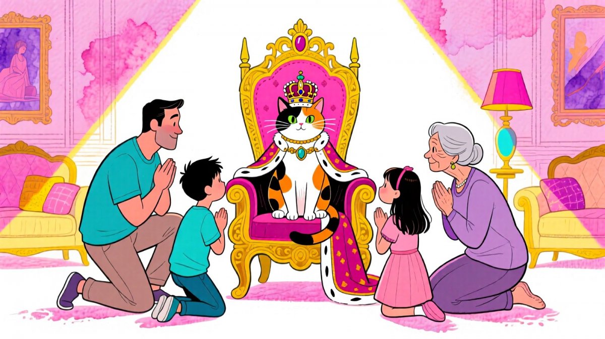 A family consisting of a father, mother, grandmother, boy and girl are kneeling before a calico cat-ruler who is seated on a lavish throne. The magnificent living room interior features elegant furnishings. The cat wears an exquisite crown and royal garments while the surrounding humans dressed in casual home clothes show deep reverence. Dramatic lighting emphasizes the regal presence of the feline monarch.