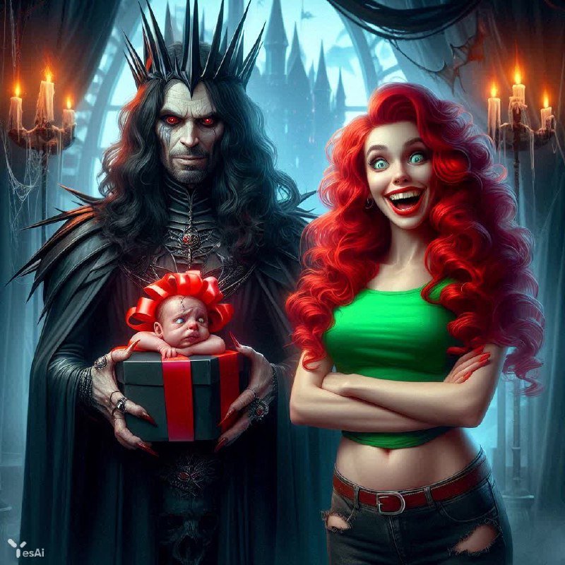 Fantasy. The Dark Lord: a man with long black hair in a gloomy robe and a dark spiked crown, holding a 0-1 year old child wrapped in a red gift ribbon with a bow, with a slight look of bewilderment on his face. Next to him is a grinning woman with red curls, wearing a bright green tank top and jeans with a mocking look. Both look at the viewer. Background: dark Gothic throne room with torches and cobwebs, magical glow, bright colors, gloomy but comical atmosphere, hyperrealism, full height