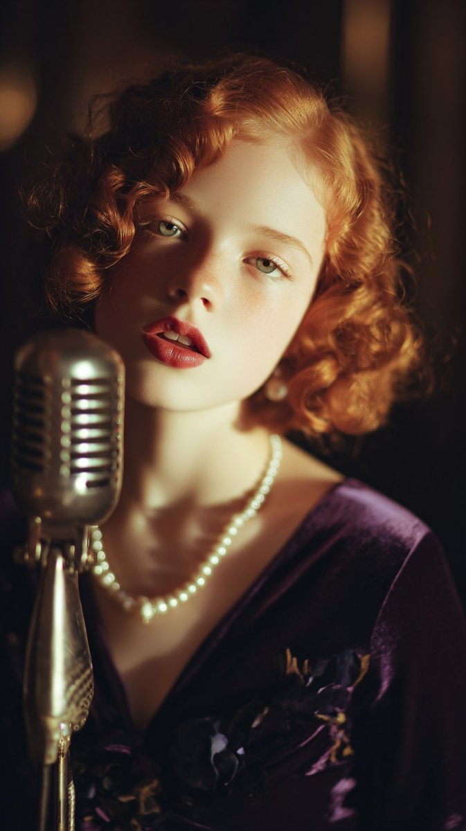 A whimsical portrait of a young girl with fiery auburn hair, adorned in a vintage velvet dress and pearl necklace, singing passionately into an antique microphone. Soft, diffused lighting reminiscent of a 1960s jazz club, capturing a moment of raw emotion and nostalgic charm. Painted in the style of Tamara de Lempicka with influences from Slim Aarons' color palettes, intricate details, dramatic light, vibrant colors, masterpiece, ultra-detailed, cinematic composition.