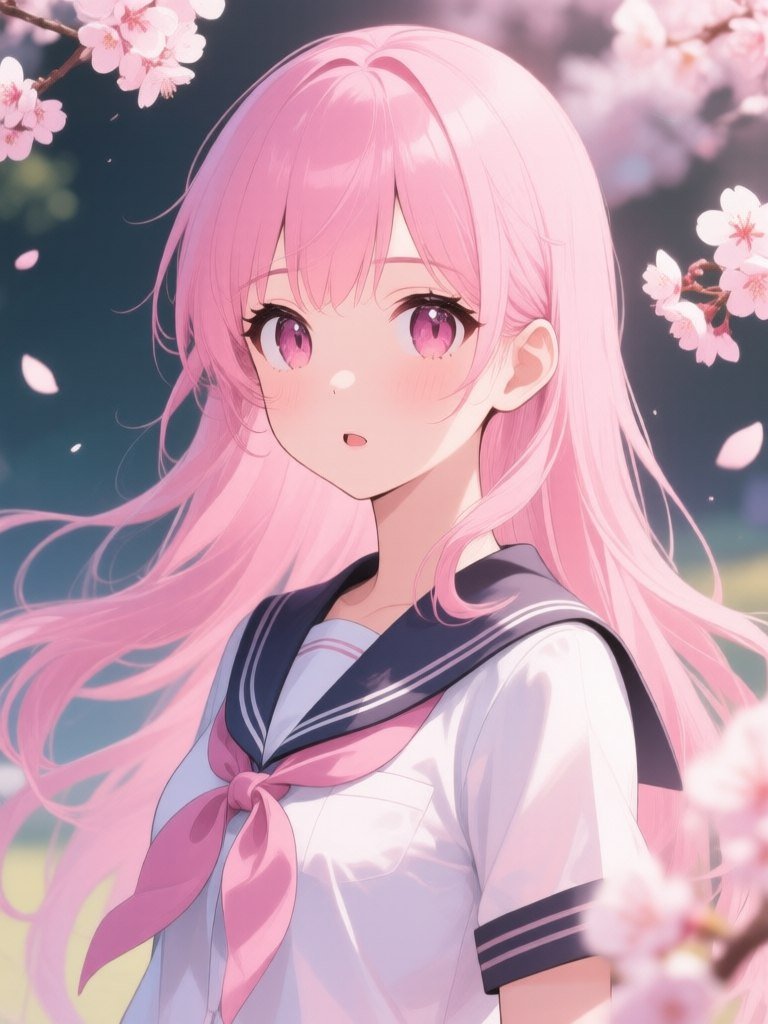 anime girl, detailed face, expressive eyes, long flowing pink hair, wearing a cute school uniform, standing in a cherry blossom garden, soft lighting, vibrant colors, highly detailed illustration, trending on ArtStation