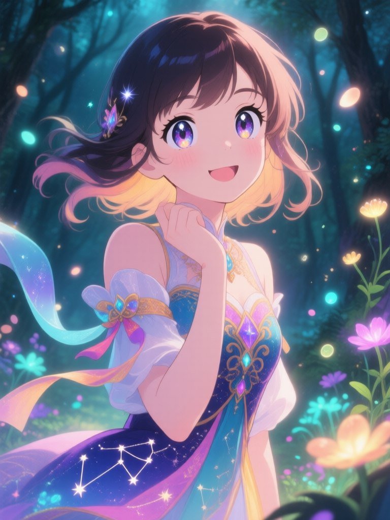 Anime character design of a young woman (18-20 years old) with vibrant colors and a playful pose, large expressive eyes filled with sparkling light, detailed clothing incorporating fantasy elements like flowing ribbons and embroidered constellations. The background is a magical forest illuminated by soft, ethereal light effects - bioluminescent flora and glowing particles floating in the air. Style: highly detailed digital painting, inspired by Studio Ghibli and Artgerm. Lighting: volumetric, rim lighting emphasizing her form.