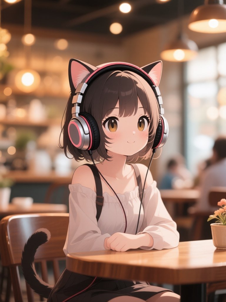 Cute anime cat-girl with oversized headphones, sitting in a cozy cafe, warm color palette, soft focus, bokeh effect.