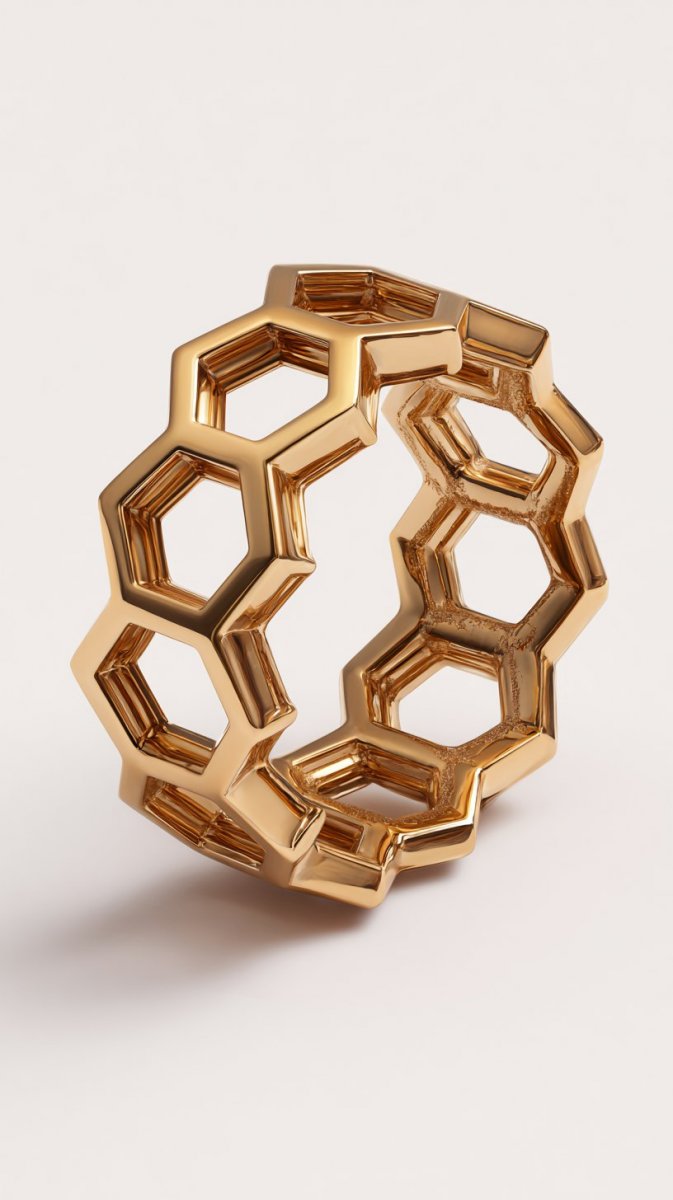 Close-up of a hexagonal ring on a clean white background, showcasing golden ratio proportions and intricate detailing inspired by Bulgari jewelry design. Elegant and gleaming gold and steel craftsmanship, heavy weight feel, luxurious texture. High resolution, studio lighting.
