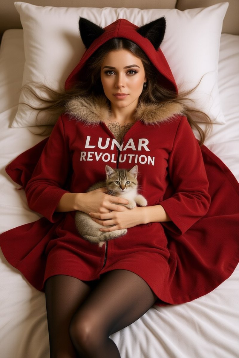 Женщина в красном балахоне с надписью : " LUNAR REVOLUTION" , мохнатый меховой варантик , капюшон с ушками кошки , в черных чулках и, лежит на кровати , волосы расползались по подушке , вид сверху, на груди у нее спит маленький пушистый котенок .