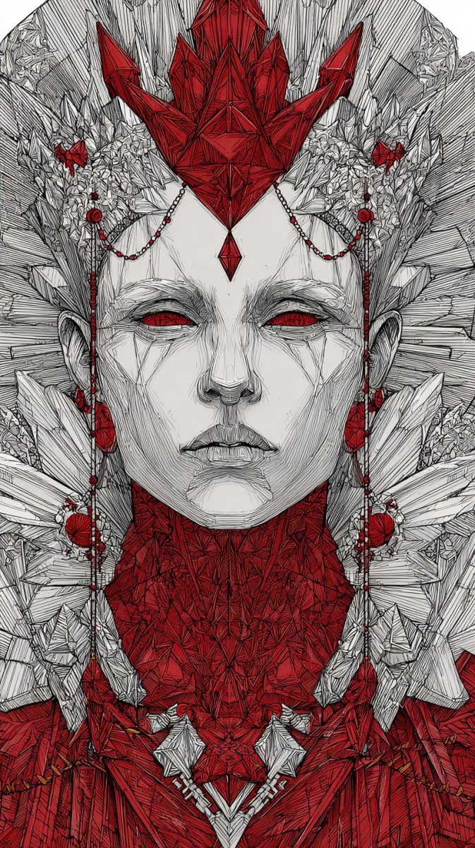 3. Illustration, ink drawing, a red queen with bright red luminous tattoos presides over her kingdom of shimmering crystals and ancient ruins. She wears an elaborate crown crafted from ruby-red gems and flowing robes woven with threads of gold. Her eyes radiate power and wisdom. The luminous tattoos pulse with an inner light, highlighting her regal aura. Epic scale, detailed rendering of the crystalline environment.