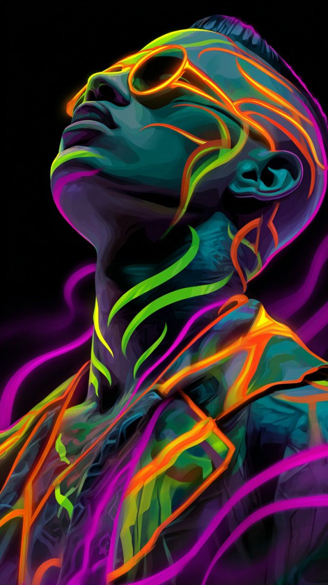 4. Illustration, ink drawing, a bimbo feminine figure with bright neon tattoos strikes a provocative pose in a futuristic nightclub setting. She is draped in holographic fabrics that shift and shimmer with every movement. Her makeup is bold and theatrical, emphasizing her striking features. The neon tattoos illuminate her skin, creating an electrifying visual effect. Dynamic composition, emphasis on light and shadow.