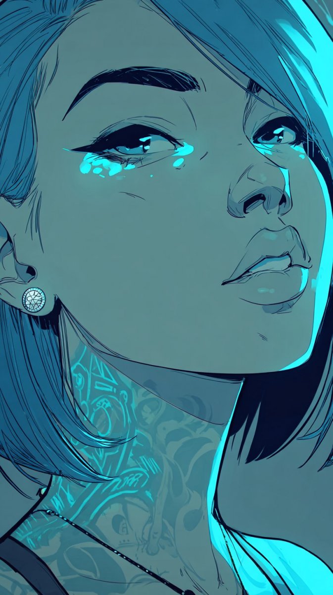 Яркая иллюстрация в технике тушевой графики представляет собой стильный образ современной девушки с пронзительным взглядом. Её макияж поистине драматичен и подчёркнут изысканными аксессуарами, а акцент сделан на эффектную голубую подводку для глаз. На руках и шее у девушки видны светящиеся неоновые татуировки, чьи цвета гармонируют с яркими граффити, украшающими стену позади неё. Пальцы украшают многочисленные серебряные кольца, а в ухе сверкает одинокий бриллиантовый пирсинг. Выражение лица девушки – спокойное и отстранённое, создающее впечатление непринуждённой элегантности и уверенности в себе. Вся композиция излучает энергию моды и индивидуальности, демонстрируя смелое сочетание графических элементов, ярких цветов и дерзкого стиля. Изображение воплощает дух современного искусства и уличной культуры, представляя собой захватывающее визуальное повествование о красоте, силе и самовыражении. Это не просто портрет, а целая история, рассказанная языком линий, теней и ярких красок, создающая неповторимую атмосферу креативности и бунтарства. Идеально подходит для тех, кто ценит смелые решения и необычные образы