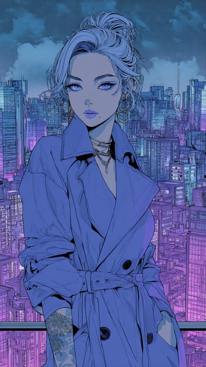 3. Illustration, ink drawing, A trendy lady with piercing eyes gazes intently into the distance, surrounded by towering skyscrapers at dusk. She wears an oversized trench coat that billows dramatically in the wind. Bright ultraviolet filigree tattoos climb her arms, intertwining with delicate silver chains and minimalist jewelry. The cityscape is rendered with a sense of gritty realism, contrasting sharply with the ethereal glow of the tattoos. #sp_spintax