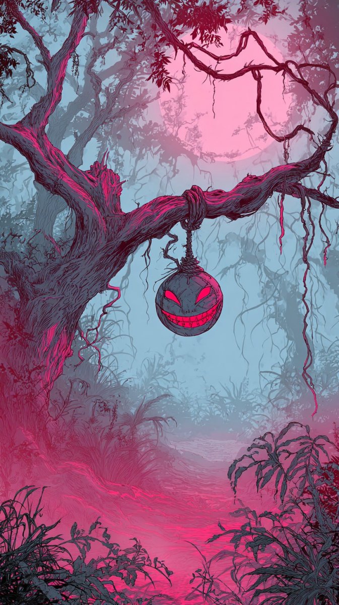 Завораживающая иллюстрация в технике тушевой графики переносит зрителя в мир мистики и таинственности. В центре композиции – кукла вуду, облаченная в элементы неоготического стиля, висящая на ветви старого, корявого дерева под бледным светом полной луны. Выразительные черты лица, особенно утрированные красные губы с хитрой усмешкой, придают кукле зловещий и загадочный вид. Яркие светящиеся татуировки в виде древних символов покрывают её поверхность, создавая жуткое свечение, которое отражается на земле подлесе. Вся сцена окутана завораживающим туманом, усиливающим атмосферу мистического напряжения и дискомфорта. Работа выполнена с вниманием к деталям, передает ощущение потусторонней силы и древних ритуалов. Использование темных тонов и контрастов подчеркивает драматизм сцены, а стилизация черт лица куклы добавляет ей характерности и индивидуальности. Картина вызывает чувство тревоги и одновременно притягивает своей загадочностью, погружая зрителя в мир тайных знаний и запретных практик. Это мрачное и красивое произведение искусства – отражение темной стороны человеческой души и силы древних верований. Наблюдая за этой сценой, невозможно не почувствовать себя частью потустороннего мира, где реальность переплетается с миром духов