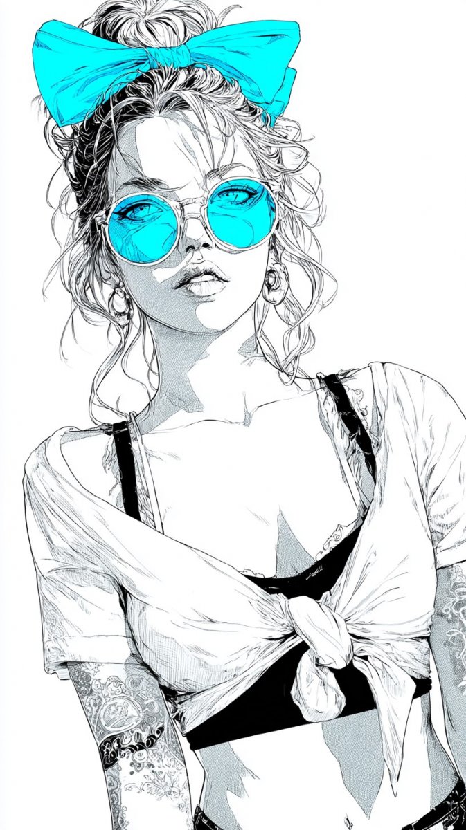 1. Illustration, ink drawing, A bimbo girl with bright luminous filigree tattoos poses confidently against a stark white backdrop. Her vibrant cyan eyes are accentuated by bold neon makeup and sparkling silver body paint. She wears a playful, oversized bow atop her head and her pose exudes carefree charm. The contrast between the intricate tattoos, bright colors, and clean background creates a captivating visual. #sp_spintax