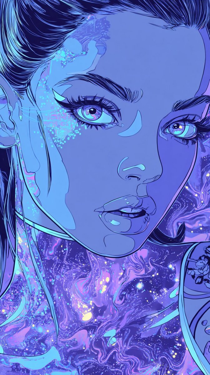 Завораживающая иллюстрация в технике чернил представляет собой лицо куклы, украшенное яркими серебряными татуировками, запечатленное в динамичной позе. Фон – завораживающие узоры туманности, создающие ощущение бесконечного космоса. Глаза куклы излучают поразительный неоновый зеленый свет, подчеркнутый выразительной подводкой, придающей взгляду особую глубину и загадочность. Она одета в футуристический боди с мерцающими деталями, отражающими великолепие галактического пейзажа на заднем плане. Контраст между четкими чертами лица куклы и космической палитрой фона создает неповторимую атмосферу неземной красоты и таинственности. Картина переносит зрителя в мир фантазий, где переплетаются реальность и вымысел, создавая ощущение присутствия в далекой вселенной. Это произведение искусства – ода современному искусству и вдохновение для тех, кто стремится к новым горизонтам творчества. Иллюстрация воплощает собой уникальное сочетание моды будущего, космической эстетики и яркого самовыражения, предлагая зрителю погрузиться в мир фантастических образов и безграничных возможностей. Работа выполнена с мастерством и вниманием к деталям, каждый штрих передает эмоции и создает неповторимую ауру загадочности. Это больше чем просто изображение – это история, рассказанная языком искусства