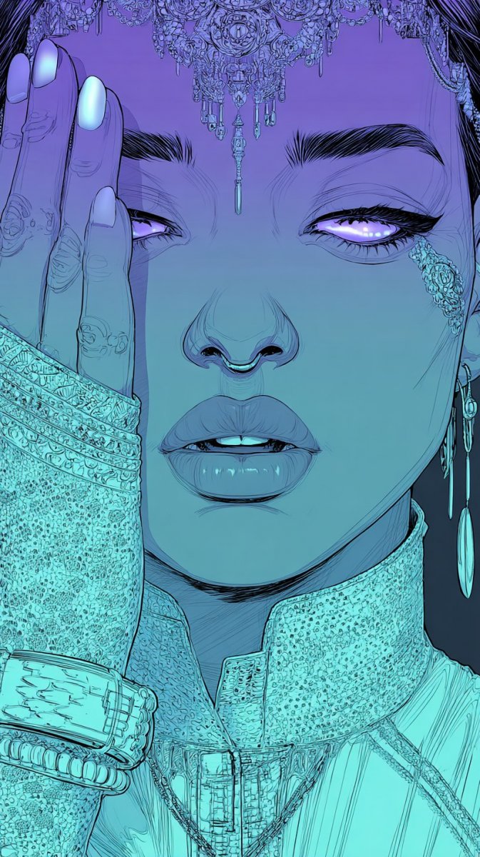 3. Illustration, ink drawing, A trendy lady with piercing eyes showcases dramatic makeup and elaborate accessories. Her face is adorned with bright ultraviolet filigree tattoos that seem to shimmer and shift in the light. She wears a futuristic, silver jumpsuit and stands amidst holographic projections. Sharp focus, detailed textures, high-tech environment. #sp_spintax